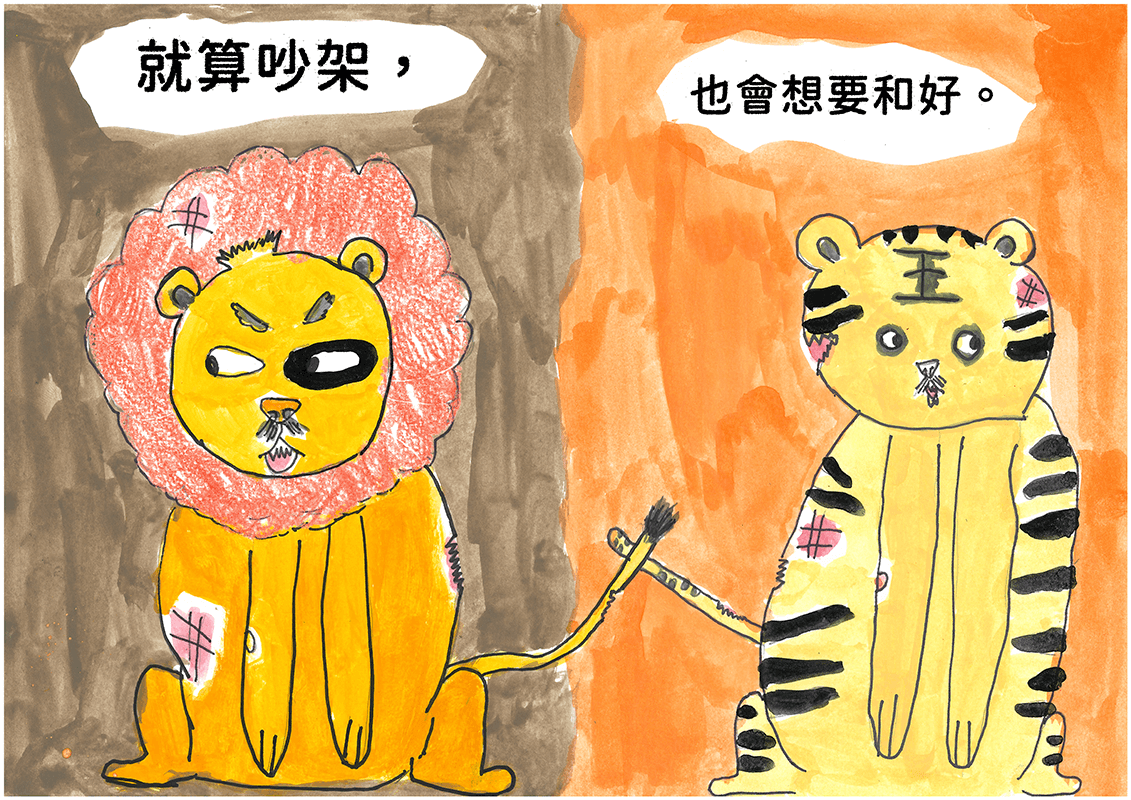 這次的故事有吵架、有和好,我覺得就像生活一樣,朋友之間有時候會生氣,但只要願意說開,就會變回好朋友。我很謝謝老師和爸爸媽媽阿公阿嬤一直鼓勵我,也謝謝評審喜歡我的故事。以後我還要繼續畫更多自己的故事,讓大家看到都能笑起來!