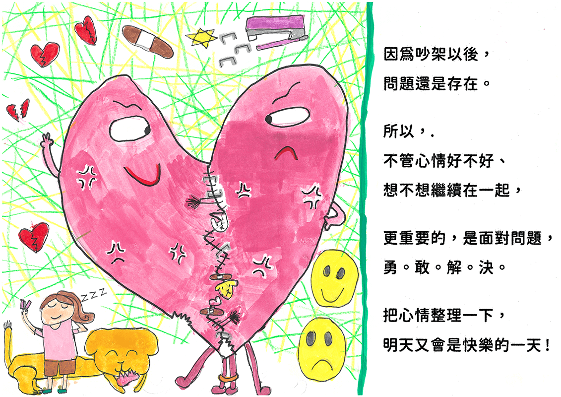 這次能得到佳作,我真的好開心!這次的題目和好,大家都認為要回到像原本的關係裡相處,但我覺得不一定,也可以變成有時候聊天、一起玩的朋友,不用時刻在一起,很開心評審可以認同我的想法!媽媽在我跟同學吵架的時候都會跟我說:「只要這些過程能成為我生命裡的養份,這段辛苦就不算白走!」我想,這次得獎就是我養份了吧!